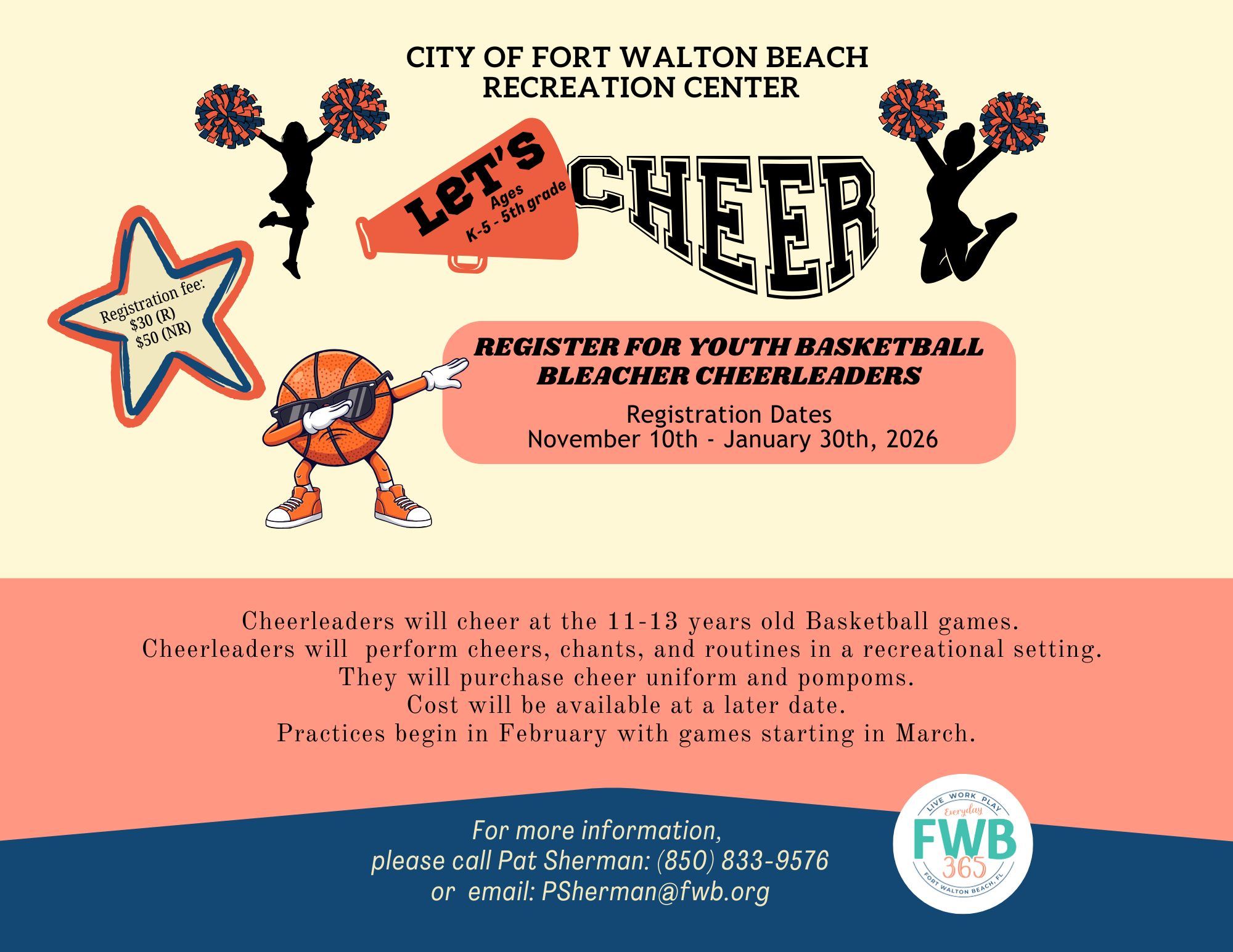 Registration for the City of Fort Walton Beach’s Youth Basketball Cheerleading team is open now through Jan. 30, 2026. Practice will begin in February 2026, with games starting in March 2026.